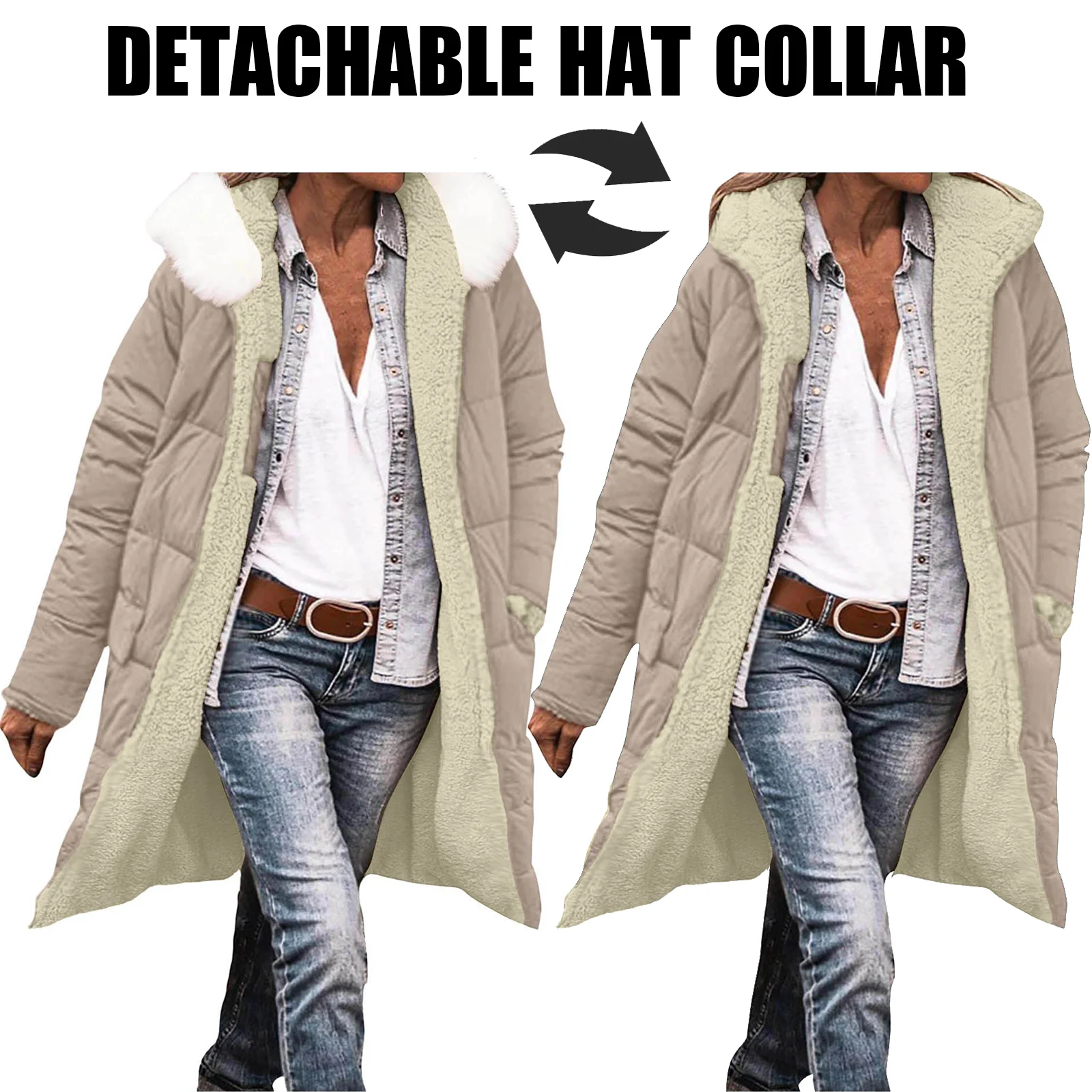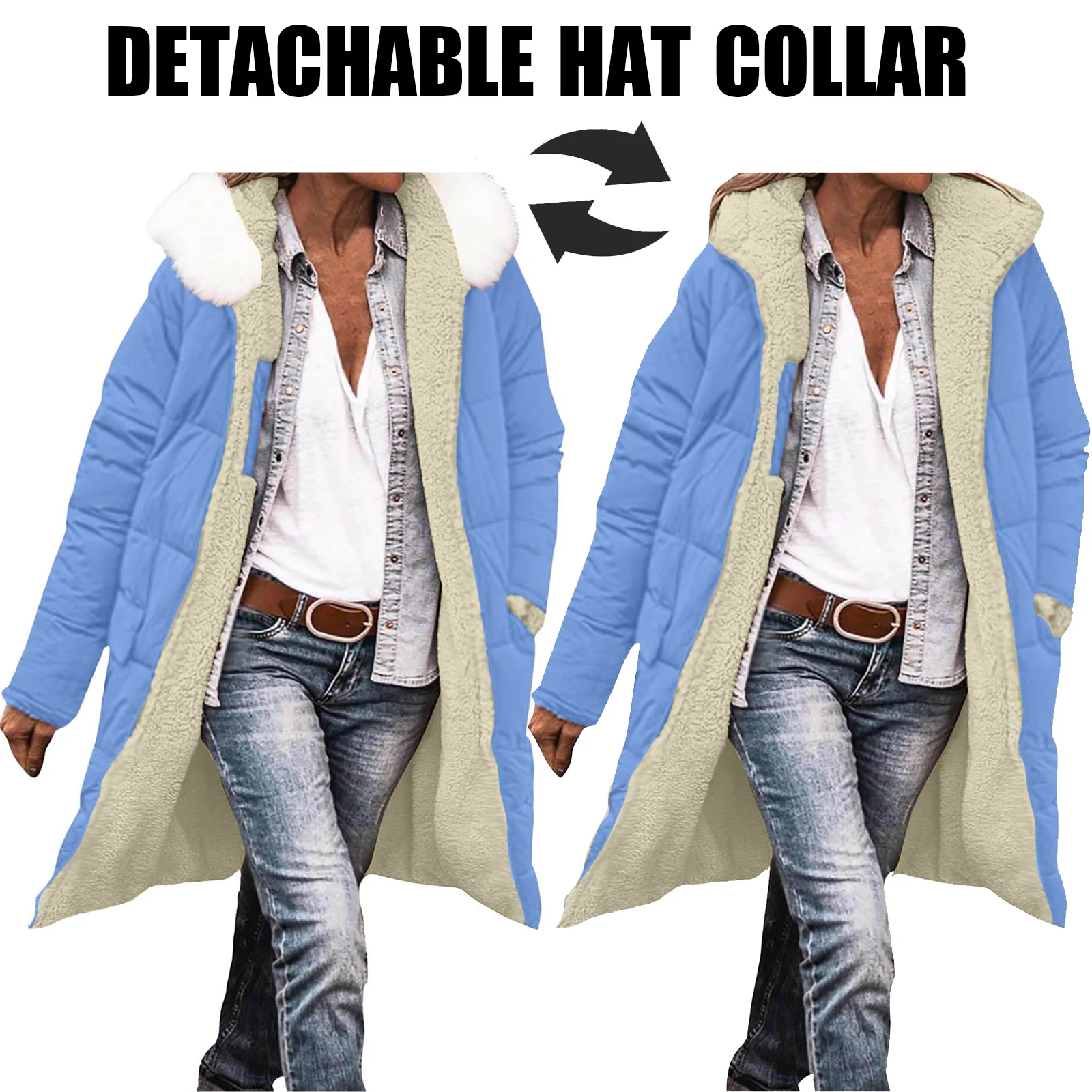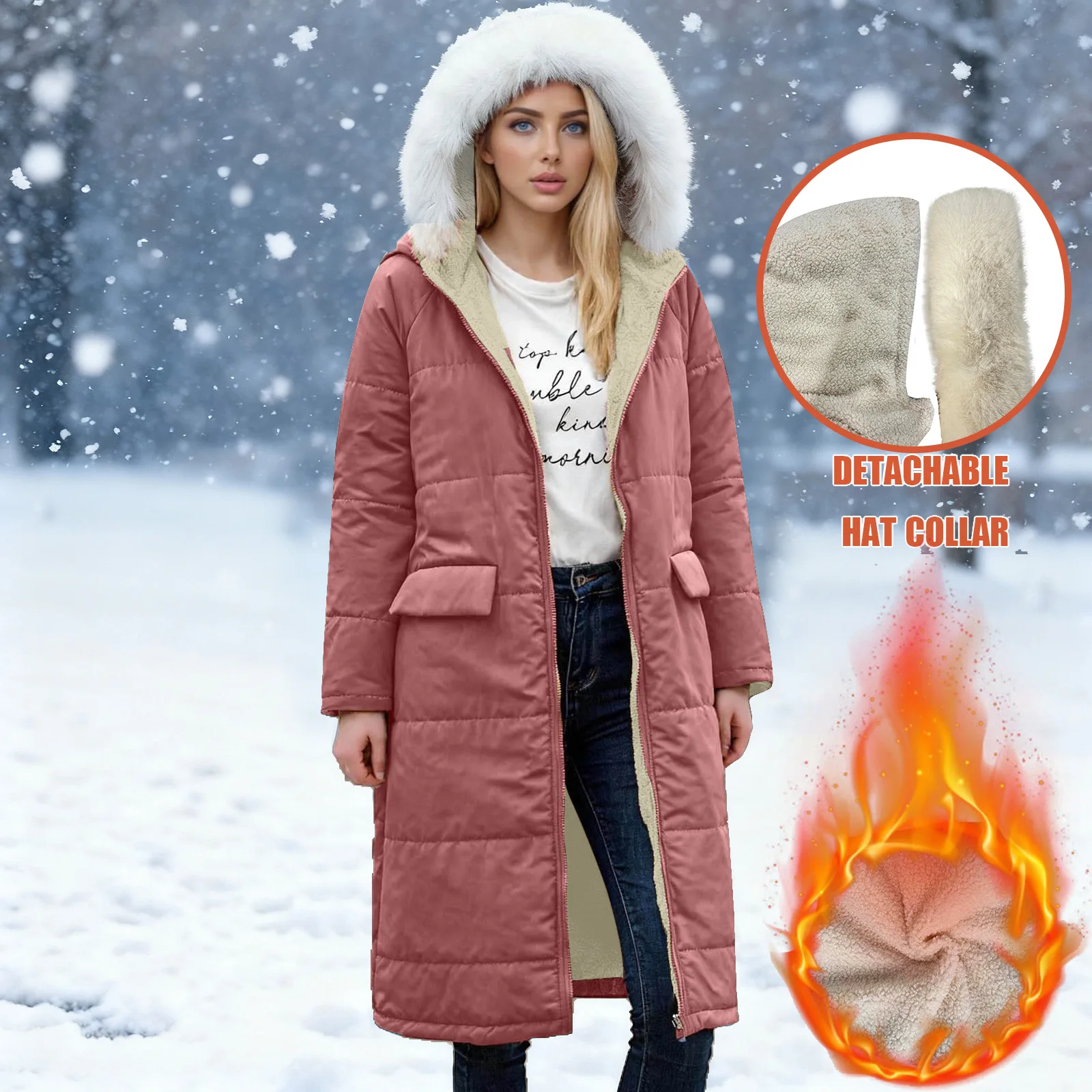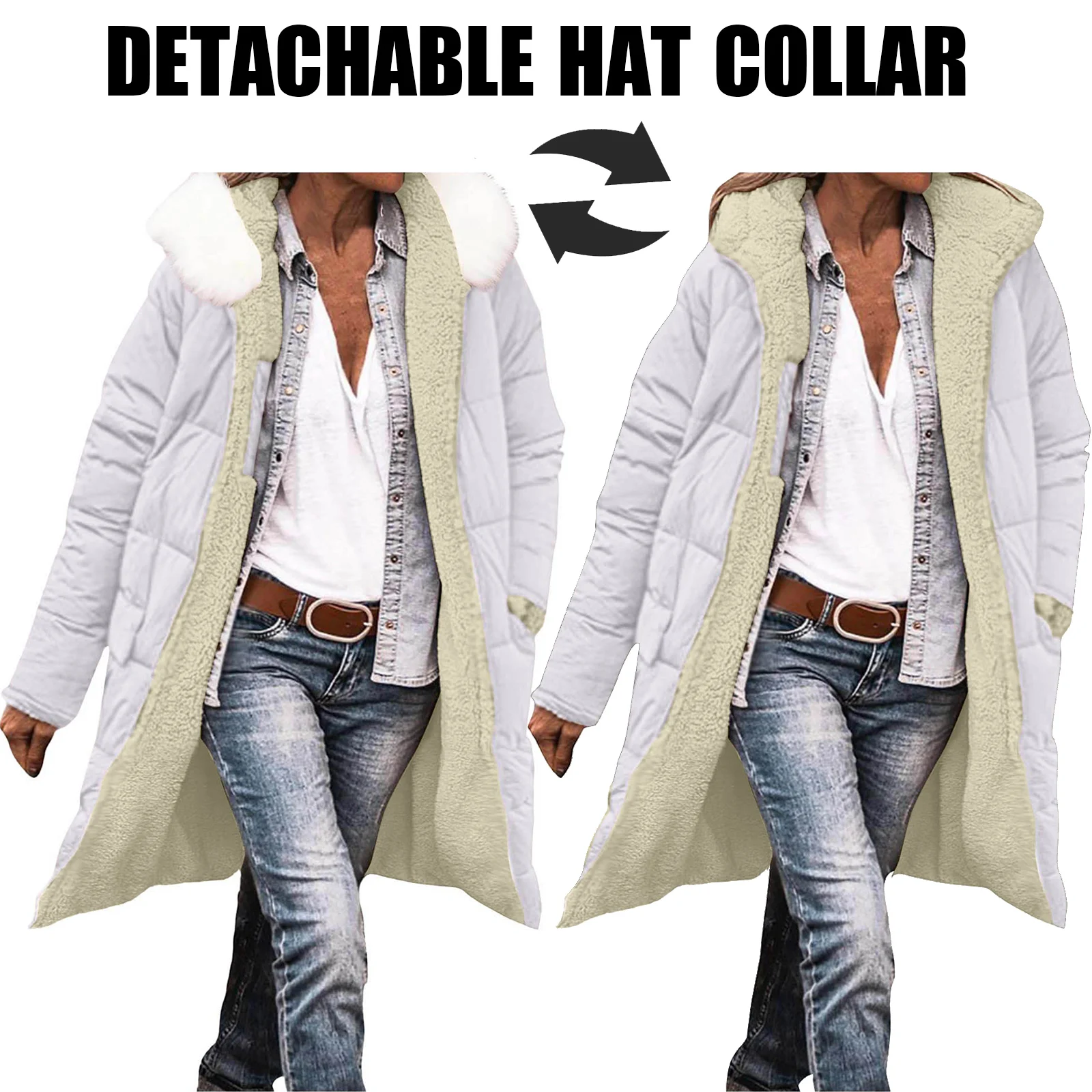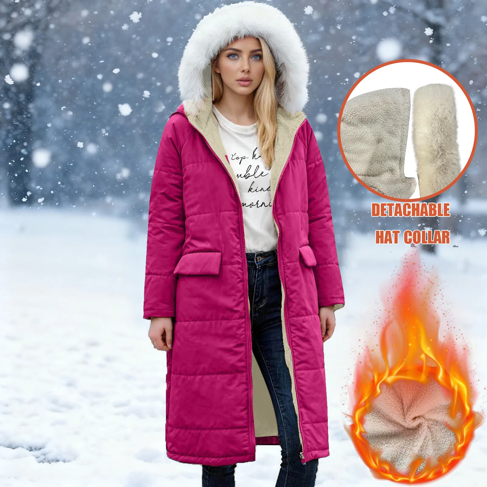 Hairy collar Women's 2025 Warm Winter Coats Reversible Sherpa Fleece Long Hooded Puffer Jackets Outerwear