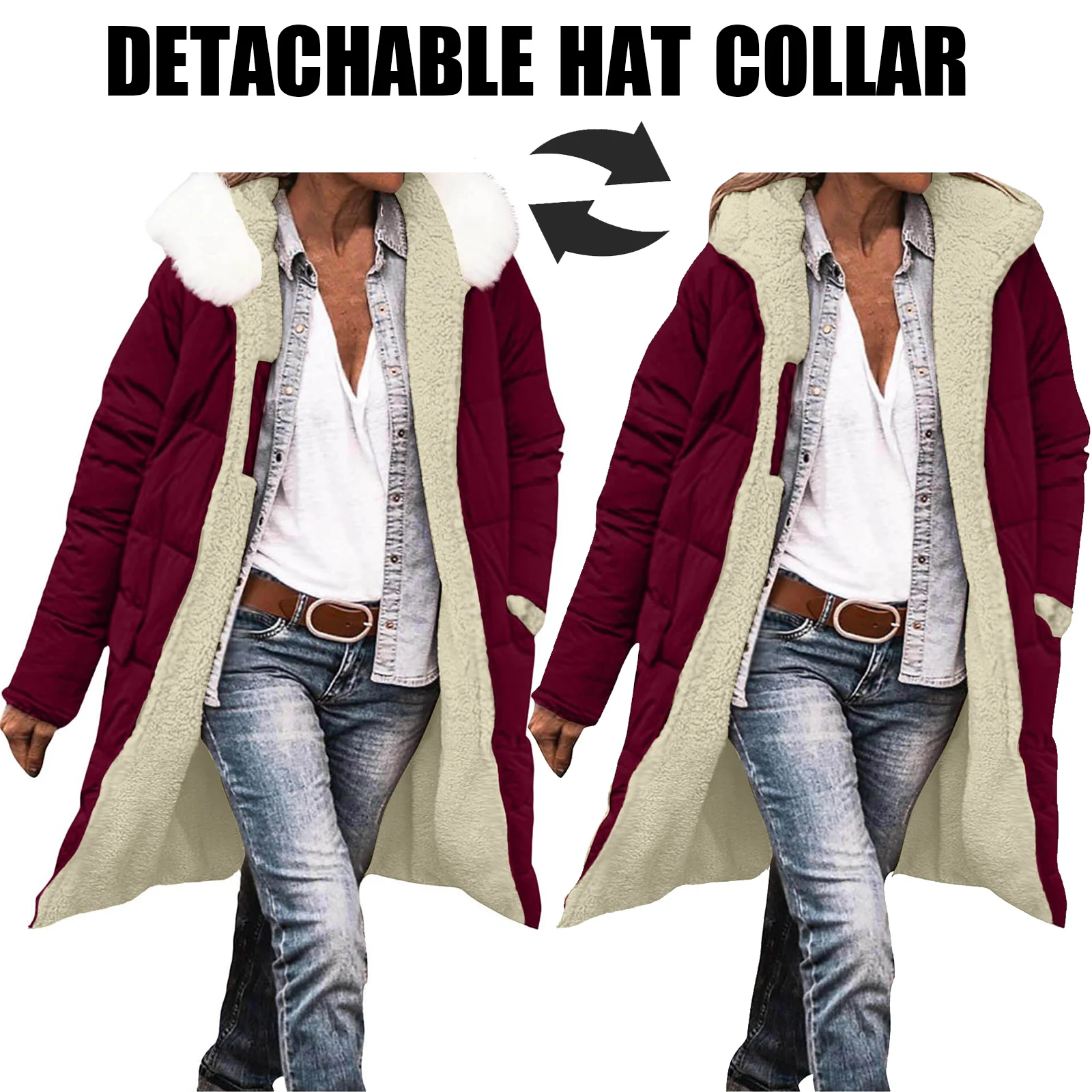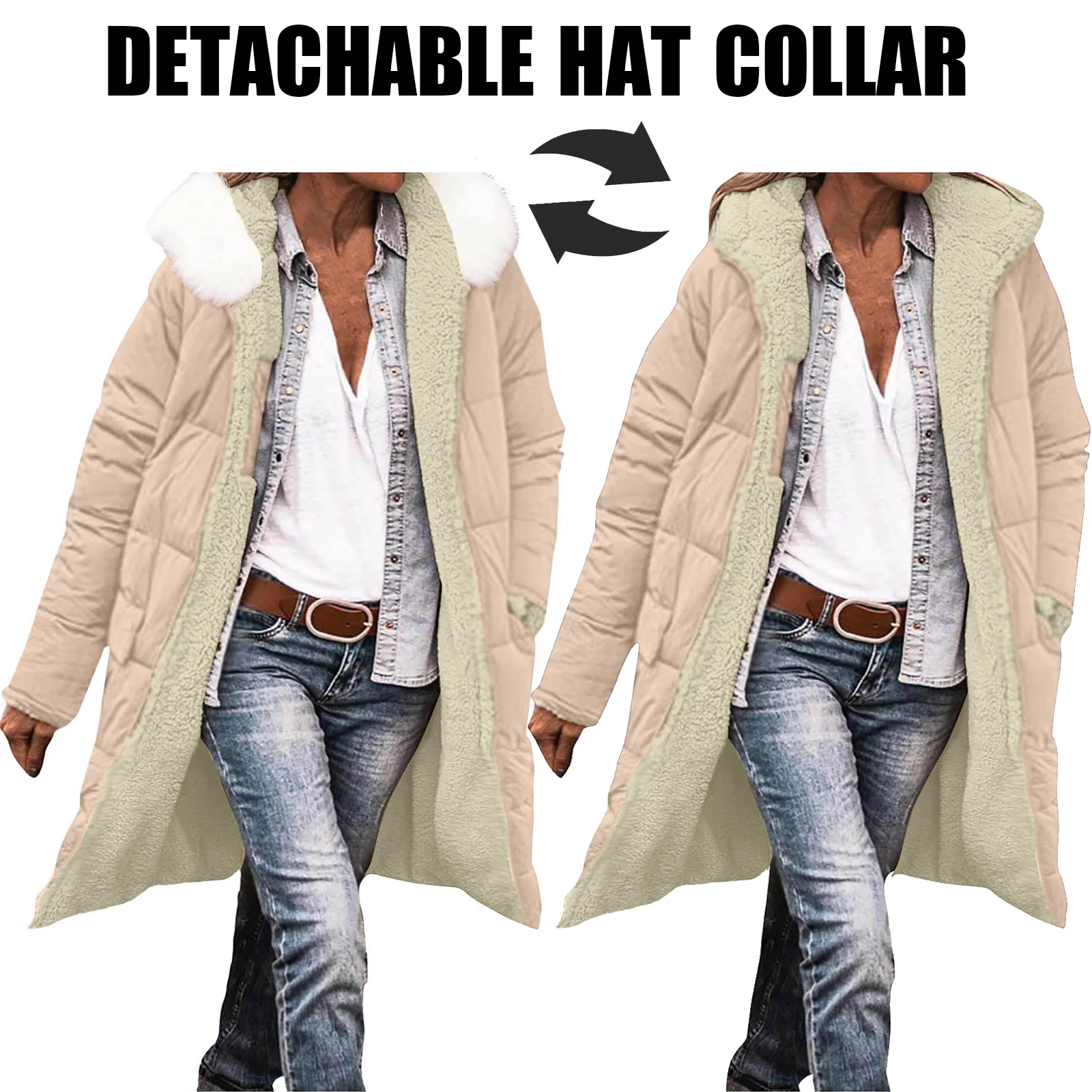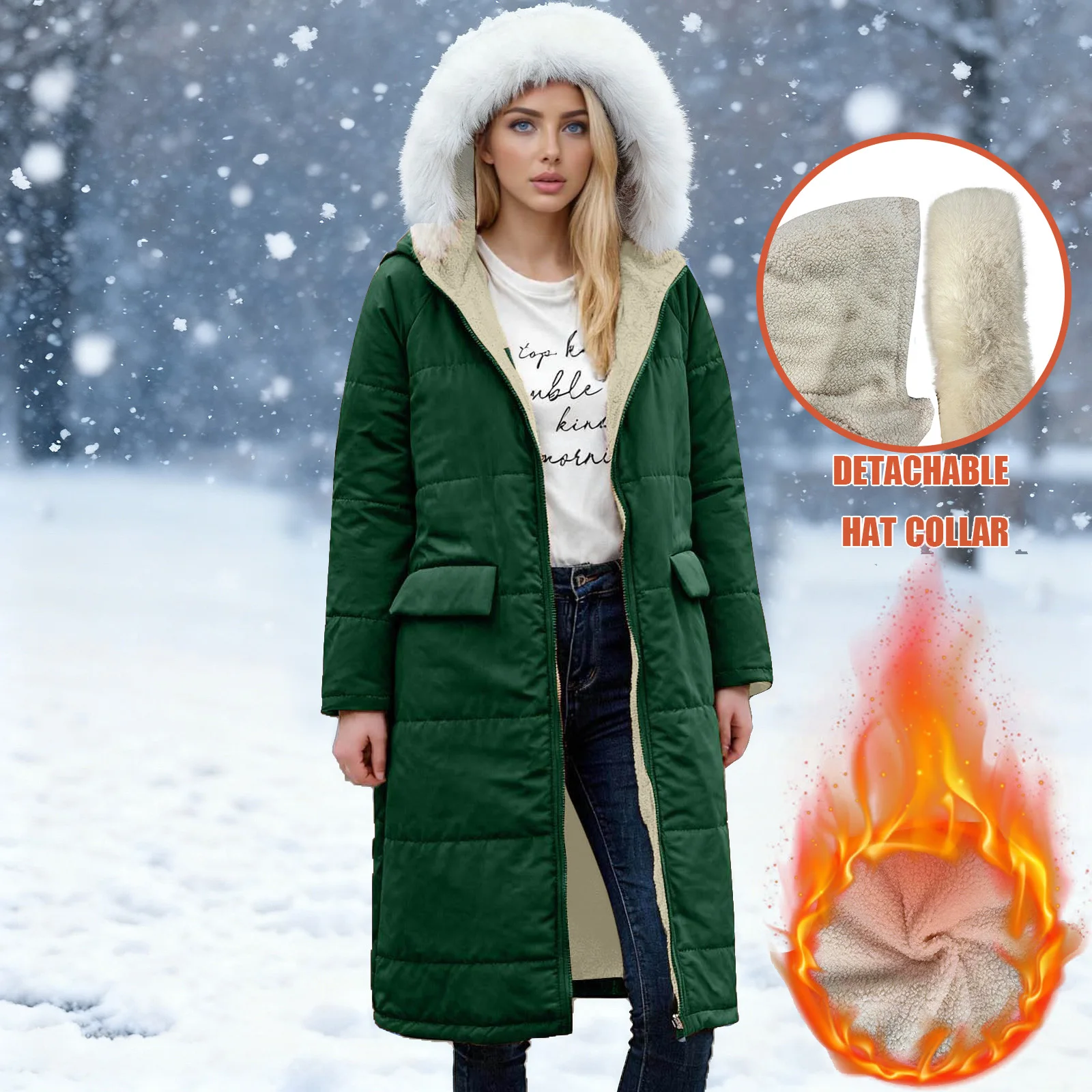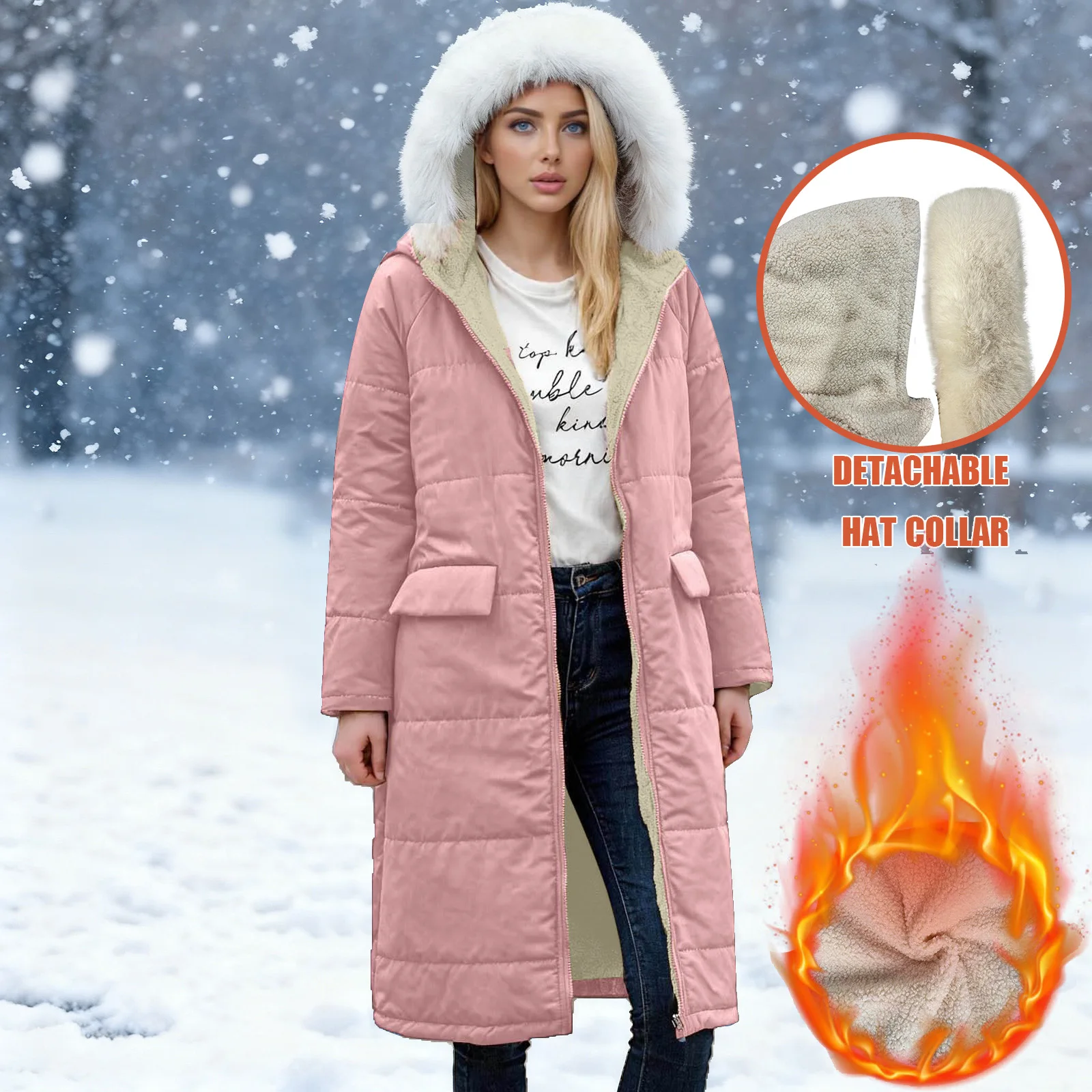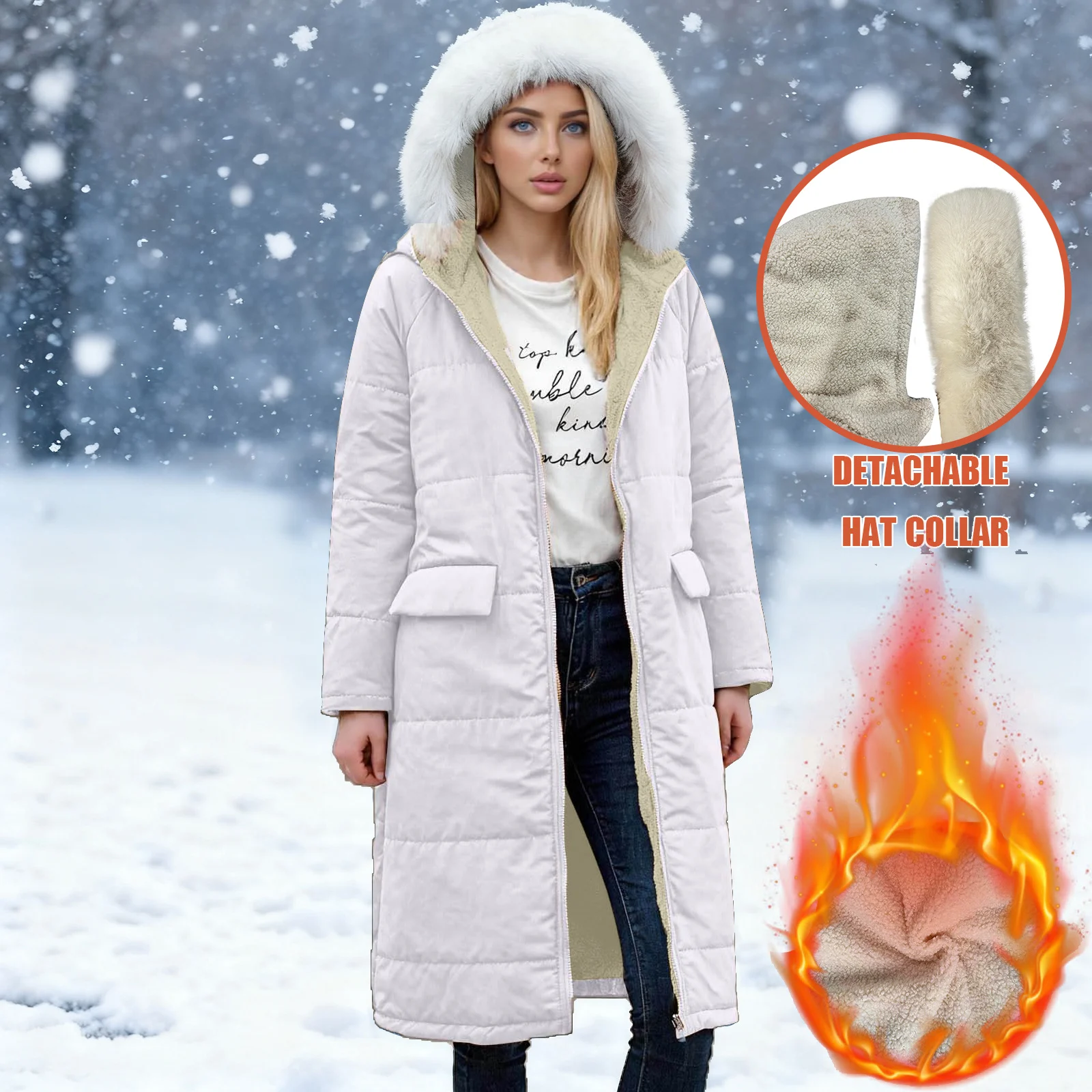 Hairy collar Women's 2025 Warm Winter Coats Reversible Sherpa Fleece Long Hooded Puffer Jackets Outerwear